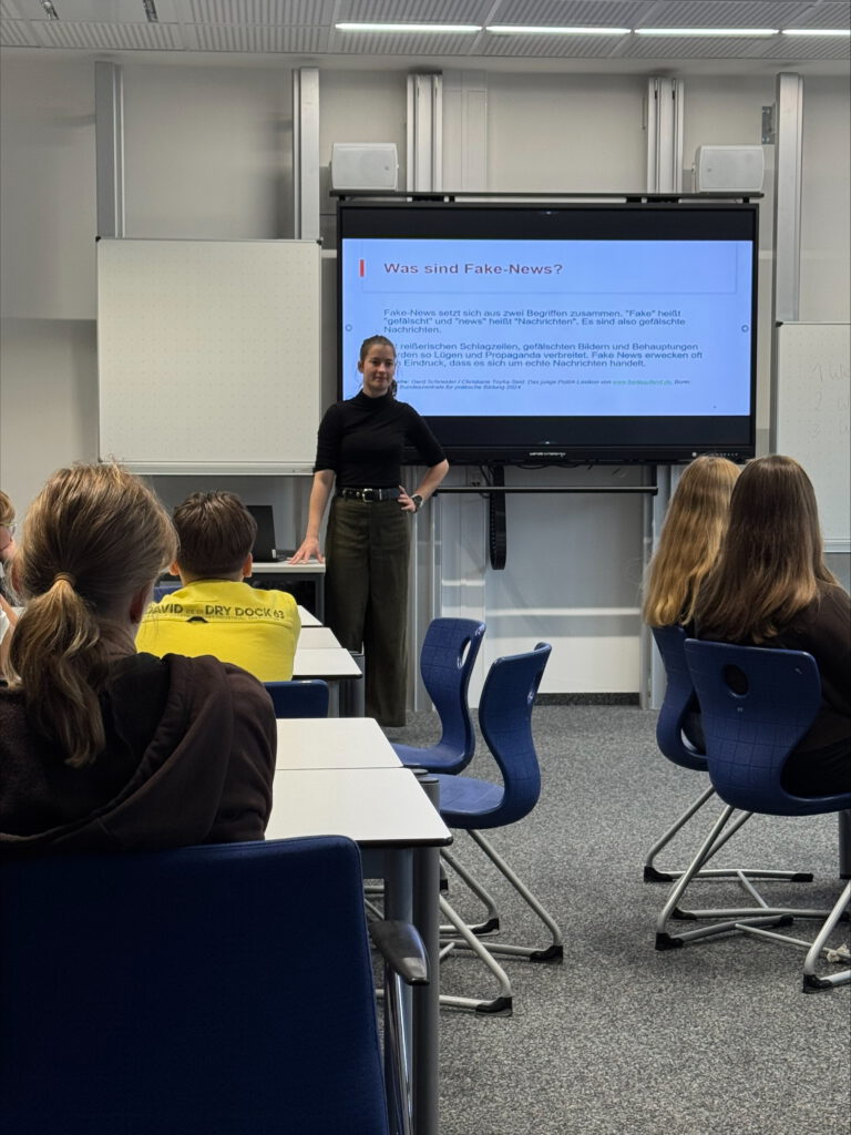 Vortrag über Desinformation und digitale Empathie Am 23. September 2025 fand im Rahmen unseres Projekttags ein informativer und interaktiver Vortrag für die achten Klassen statt. Die Volontärin Anja Volkwein von der Medien-Akademie Augsburg, die Teil des Volo-Bandes ist, stellte sich den Schülern vor und behandelte das wichtige Thema „Desinformation und