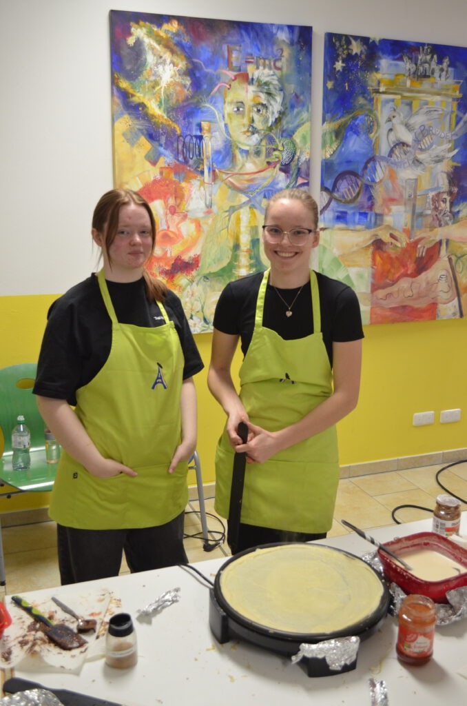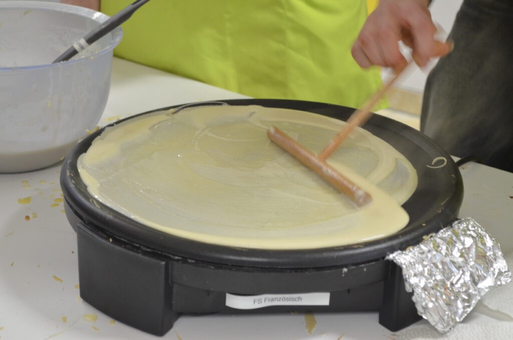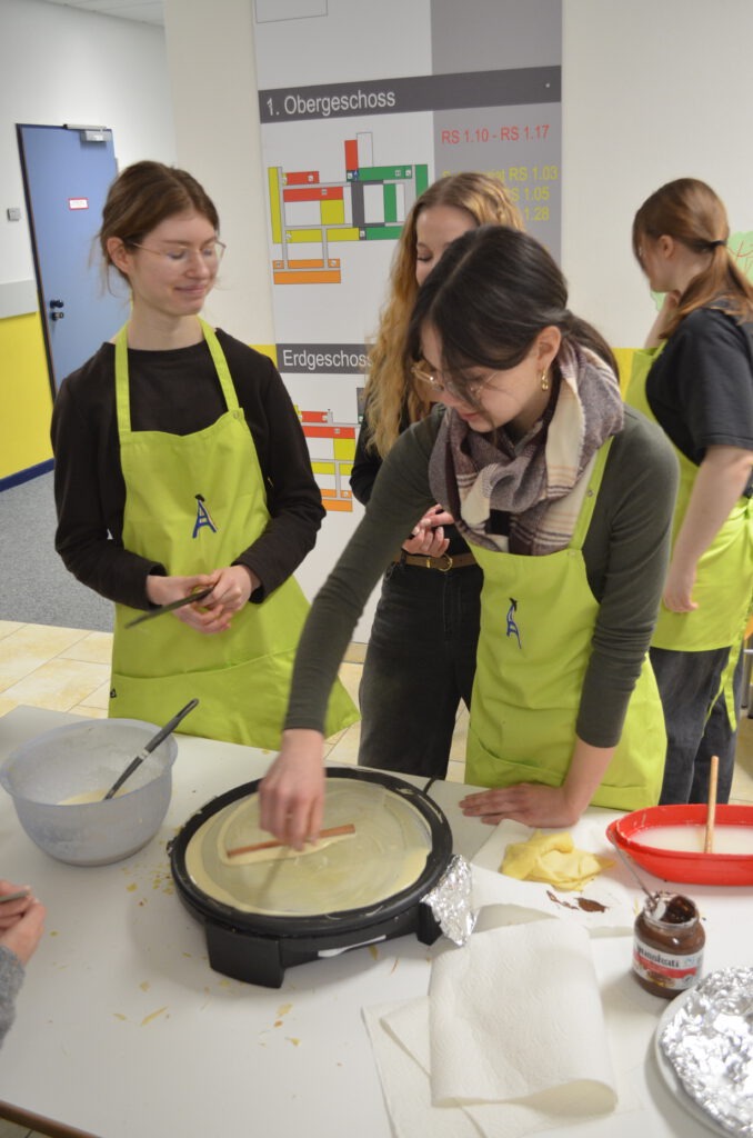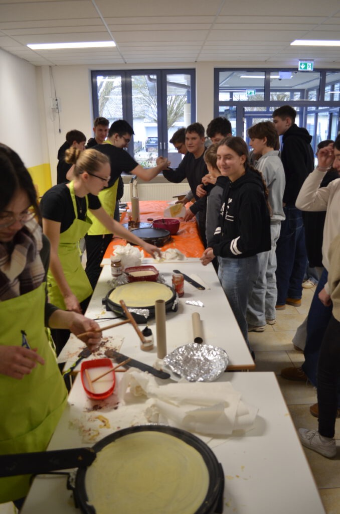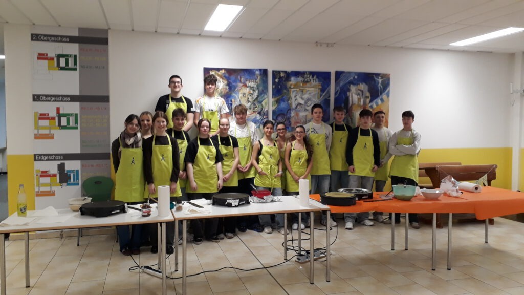 So lautete auch heuer wieder die Durchsage, die den deutsch-französischen Tag an der RSR ankündigte. Und so zog am Donnerstag, 22. Januar, der Duft frischgebackener Crêpes durchs Schulhaus, woraufhin kurze Zeit später Schülerinnen und Schüler aller Jahrgangsstufen in der Lobby vor den Tischen Schlange standen. Die Klasse 10 C IIIa hatte alle Hände voll zu tun, den Hunger ihrer Mitschüler auf die dünnen Pfannkuchen mit süßer Füllung – Nutella, Marmelade oder einfach nur Zucker und Zimt – zu stillen.